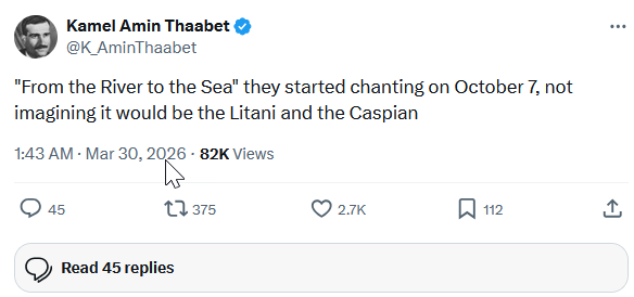 Has started firing rockets at Israel again. Took them a month. Another sign that Iran is in dire straights.