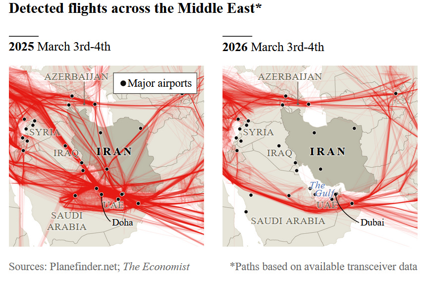 (As 1,000’s of flights--even tens of thousands--have been cancelled--with several airports in the Middle East effectively closed due to Iranian strikes--net flight hours are down hugely—reducing the environmental impact of the war?)