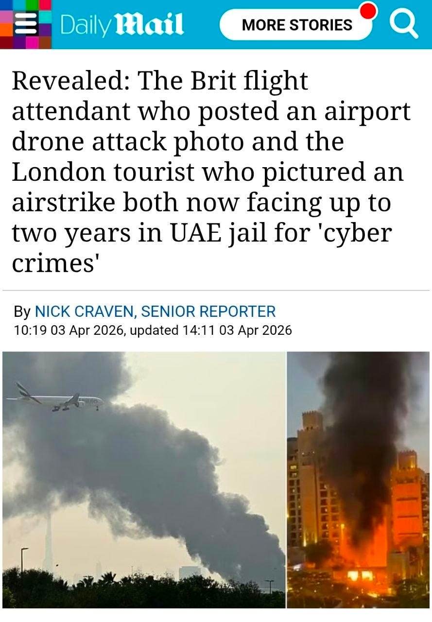 The British Daily Mail: Close to 70 Britons are detained in the United Arab Emirates for photographing and publishing images of impact sites and locations attacked by Iran within the UAE.